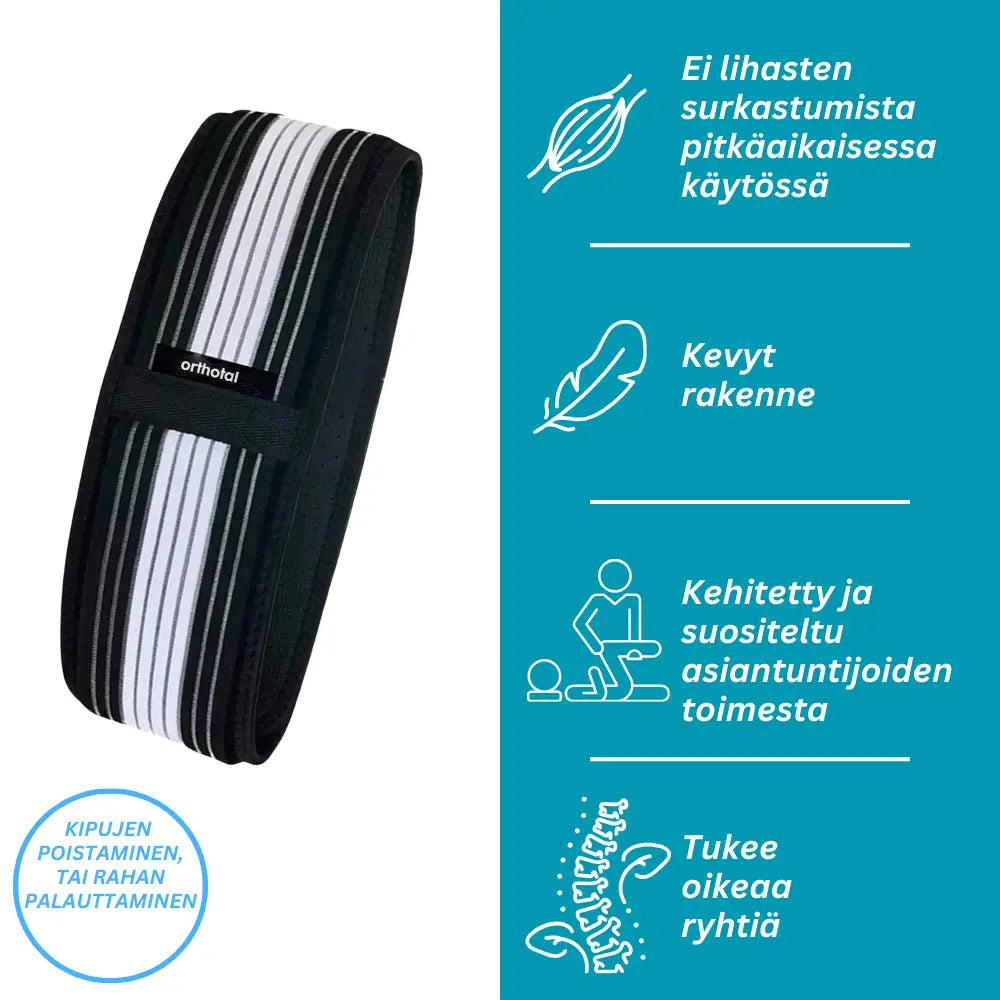 Tarjoamme tyytyväisyystakuun! Jos et ole tyytyväinen Ortovyöhön, ota meihin yhteyttä nfo@orthotal.com tarjoamme 90 päivän palautusoikeuden. eturn and refund within 90 days. Tämä aikajakso alkaa vyön saannista.