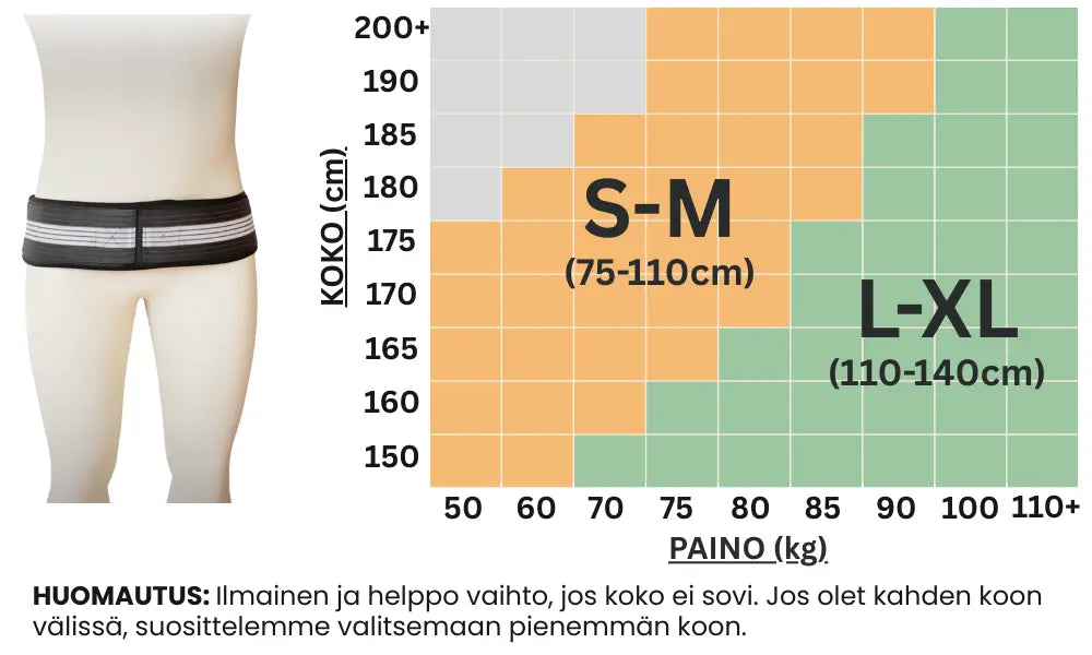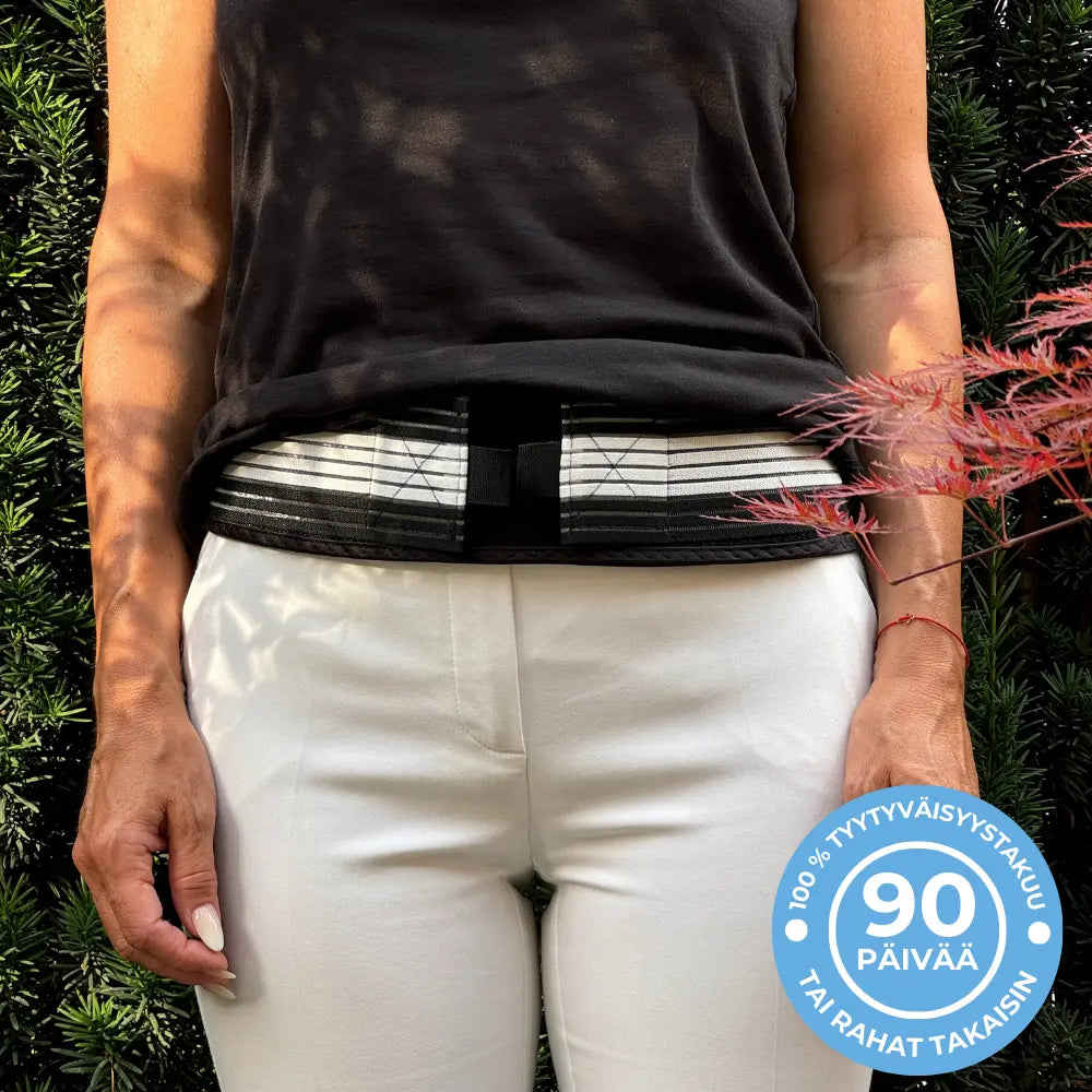 Vyön tulisi sopia tiiviisti, mutta ei liian tiukasti, että et tunne epämukavuutta tai painekohtia. Sinun tulisi pystyä liikkumaan normaalisti niin, että vyö ei paina ihoon tai liiku pois paikoiltaan. Kireyttä voidaan muuttaa helposti käyttäen joustavia kiristyshihnoja.