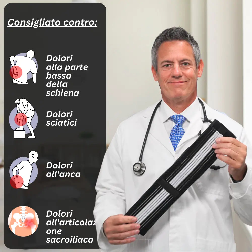 Il corretto sostegno della zona lombare e dei fianchi permette di diminuire la pressione sul nervo sciatico e di conseguenza il dolore migliorando la mobilità.