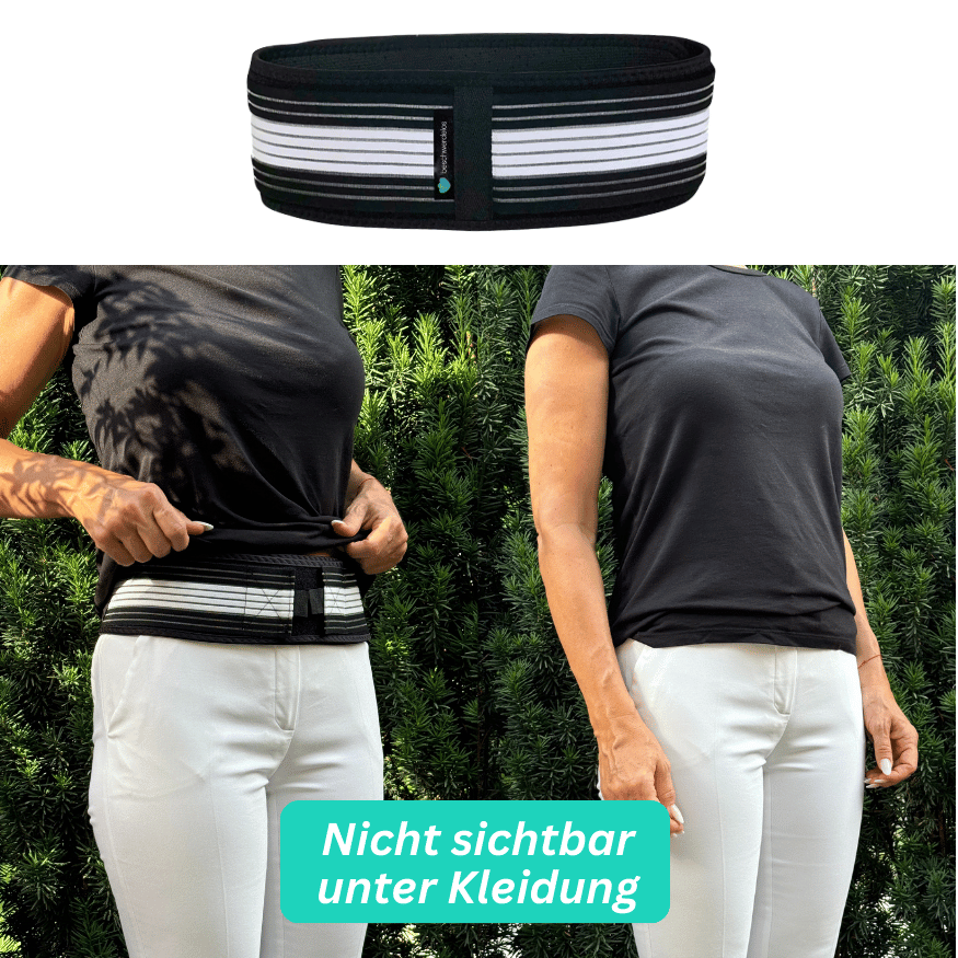 Der Gürtel sollte eng anliegen, aber nicht zu fest sitzen, um Unbehagen oder Druckstellen zu vermeiden. Sie sollten sich problemlos bewegen können, ohne dass der Gürtel unangenehm einschneidet, oder verrutscht. Die Festigkeit lässt sich leicht mit den elastischen Spannbändern anpassen.